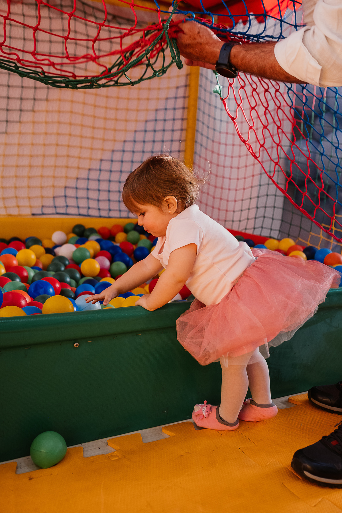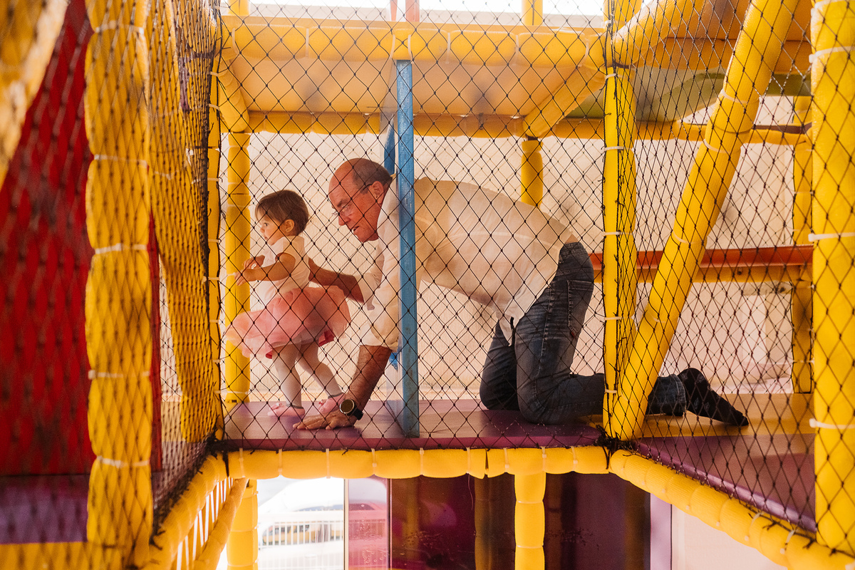 Amélia estava toda sorridente e aproveitou cada minuto da festa, inclusive subiu no brinquedão com o seu avõ para brincar com o "balão" (essa foi a 1ª palavra dela, fofa né?).