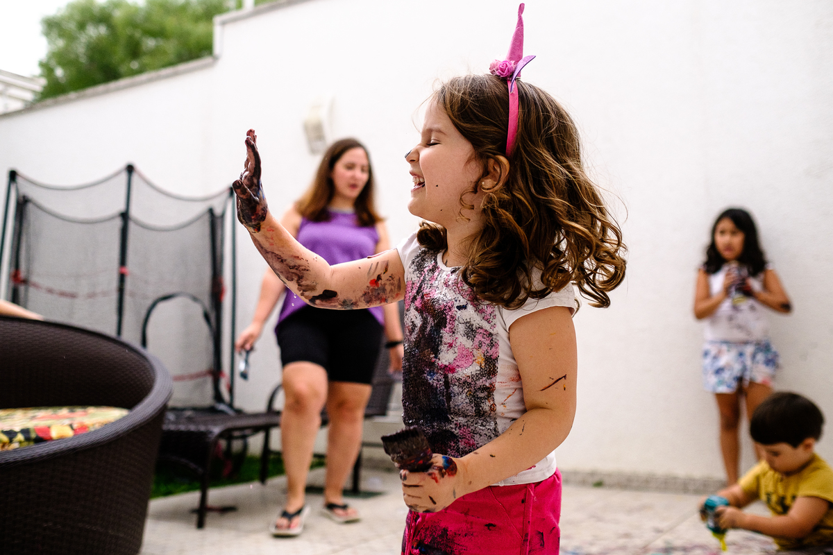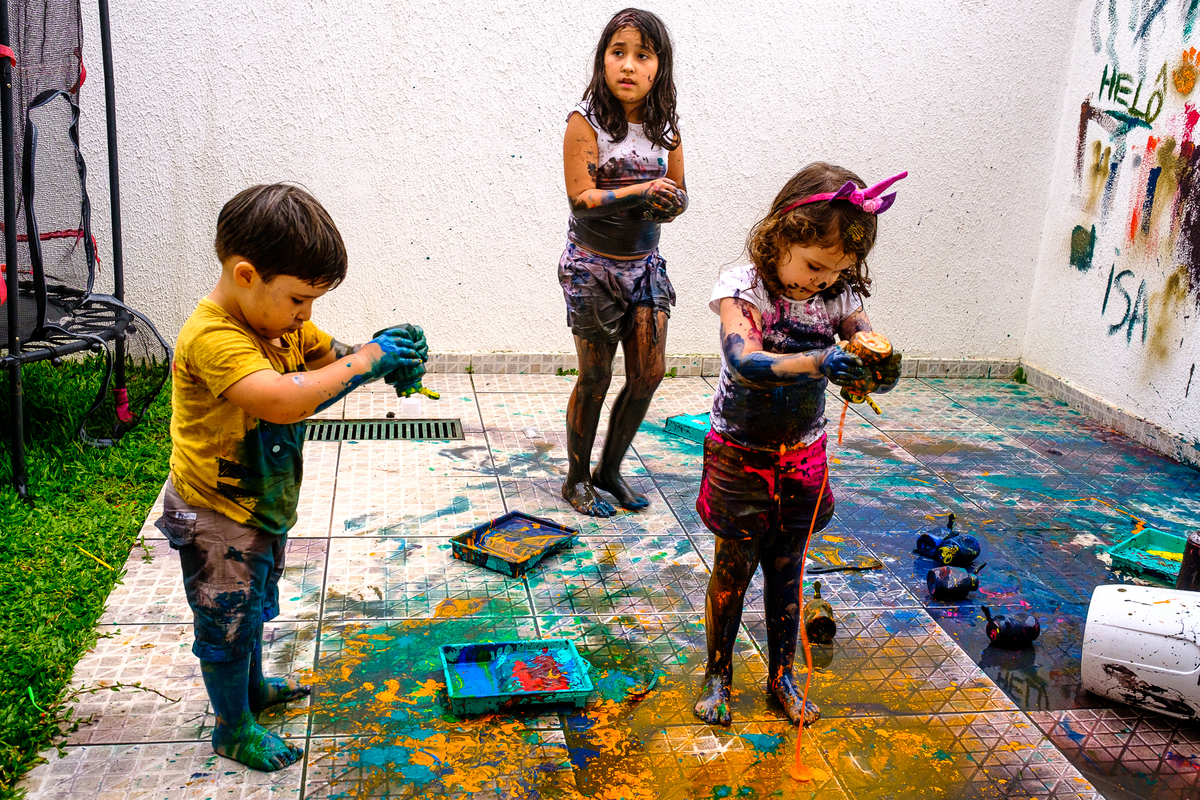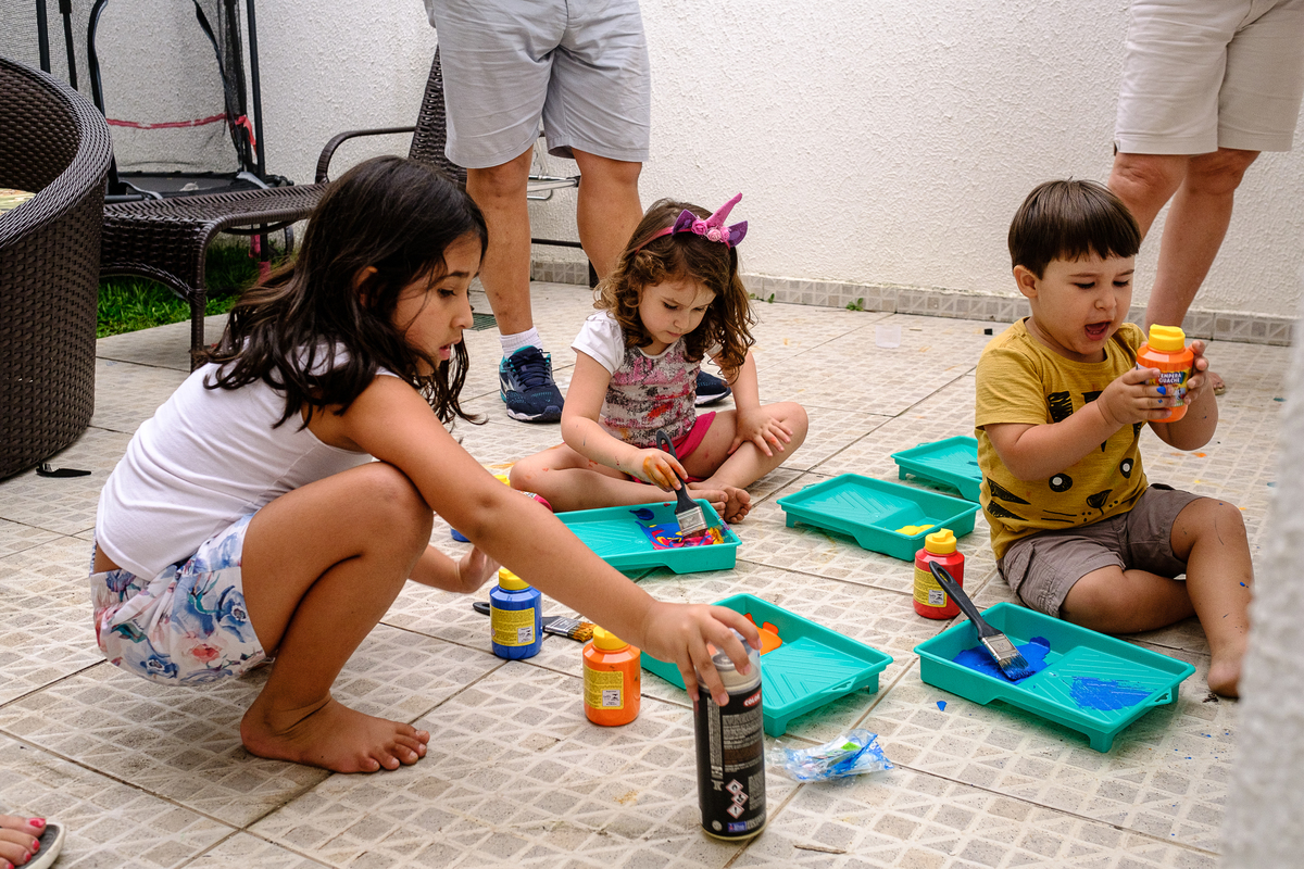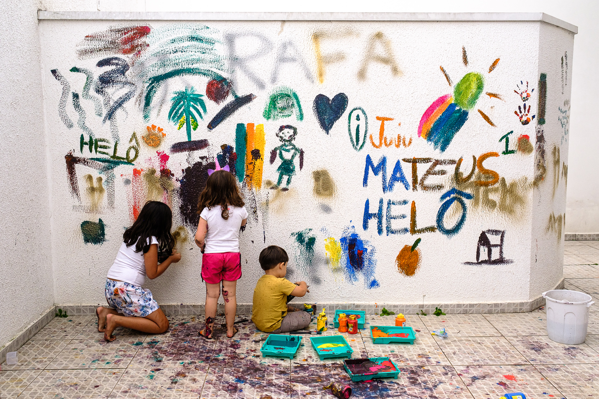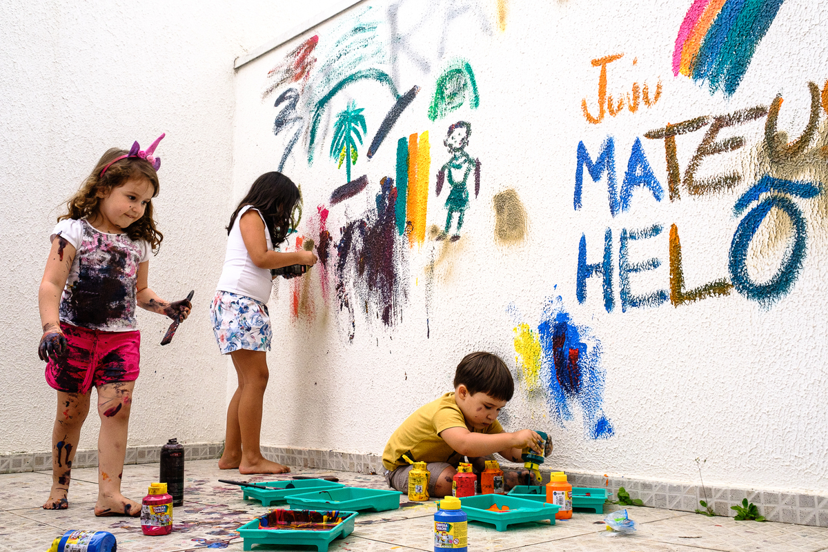 Na casa da Isa e do Rafa tinha um muro no meio do jardim. Pensando em um espaço que se adequasse a realidade com 3 filhos resolveram colocar o muro abaixo, mas antes disso me chamaram pra registrar a bagunça no "adeus ao muro". Helo, Julia e Mateus pintaram o tal muro de ponta a ponta - e claro que não ficou só por aí - o chão e eles mesmos foram pintados. Tinta, bagunça, diversão e um final de dia agitado na casa dessa super família, agora devidamente registrado. E na sua casa é assim também? Me chama que eu quero registrar toda essa loucura que vai deixar saudades.