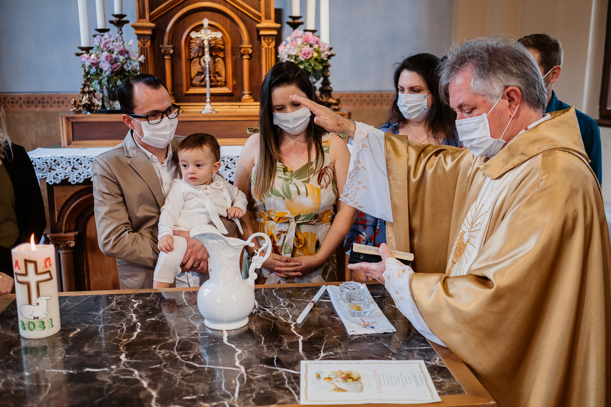O Miguel estava super tranquilo e feliz durante o batizado. Ele curtiu tanto o banhinho de água do batismo que o Padre Aparecido até repetiu pra eu garantir os melhores registros deste momento tão importante da sua vida cristã.