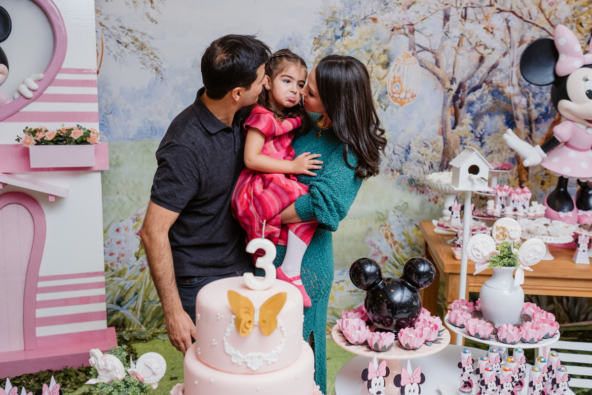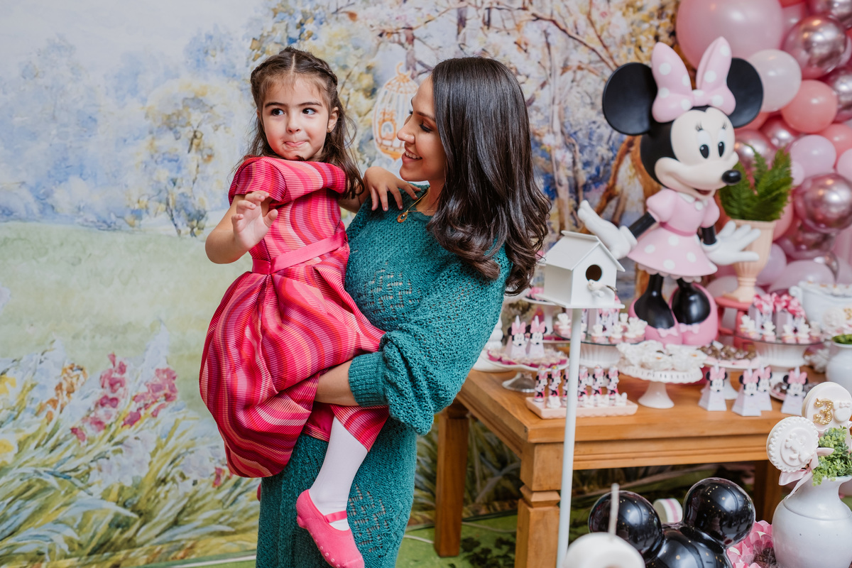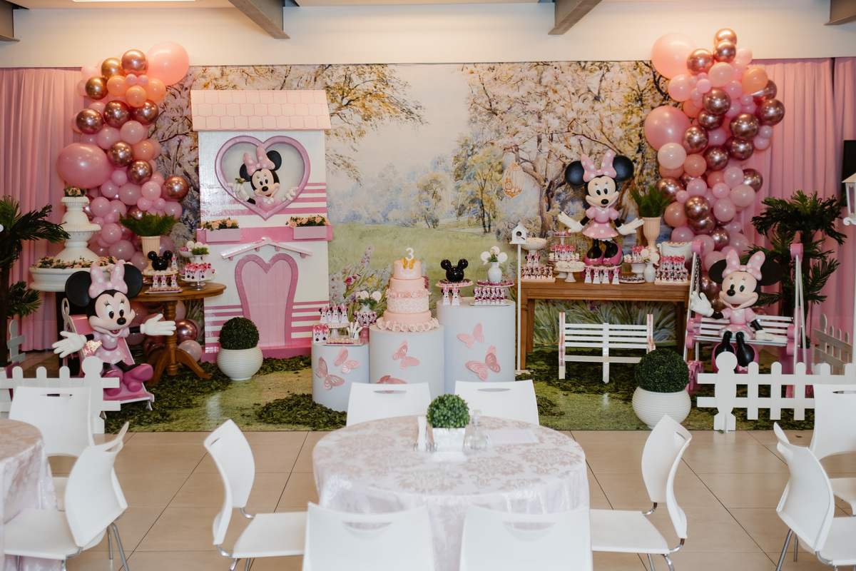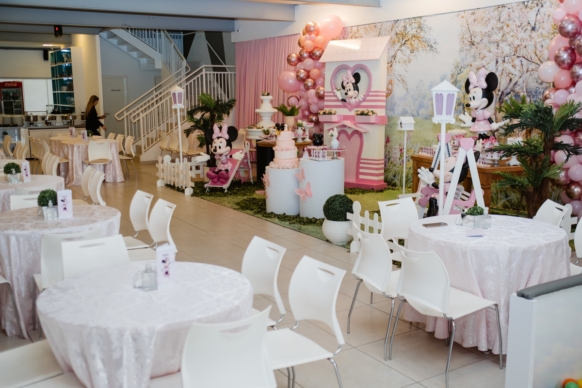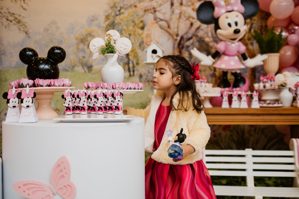 O aniversário da Luísa aconteceu no Buffet 4 Kids, em Curitiba, tema Minnie Rosa, fotografado por Evelen Torrens.