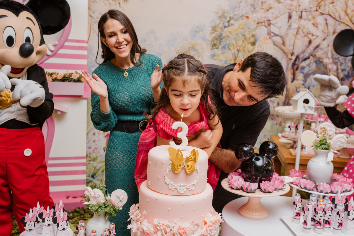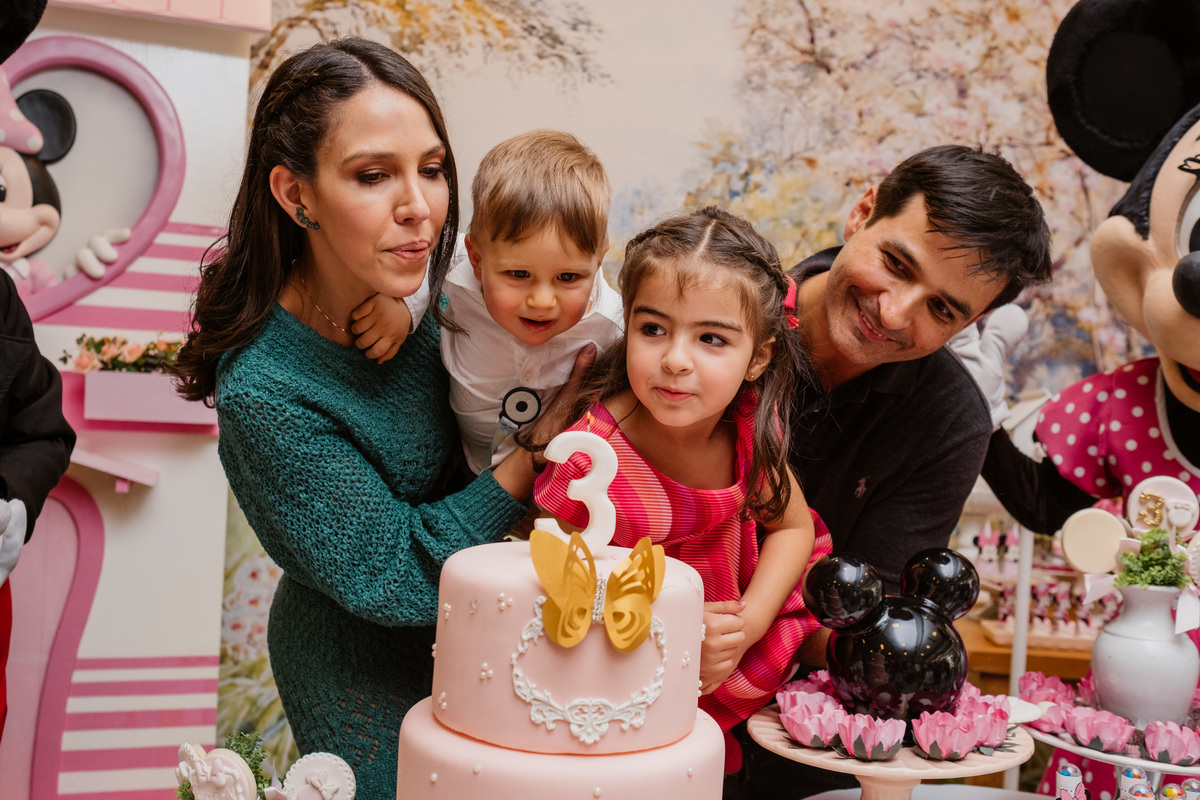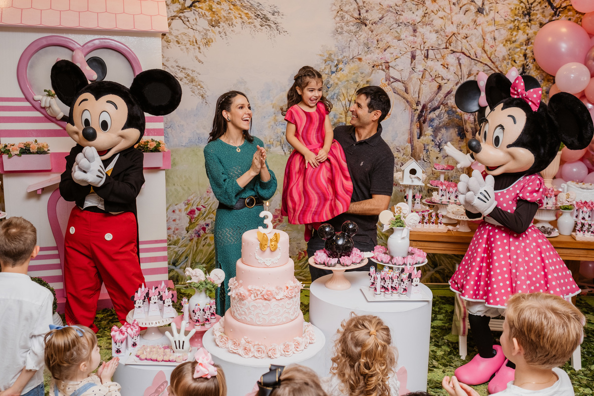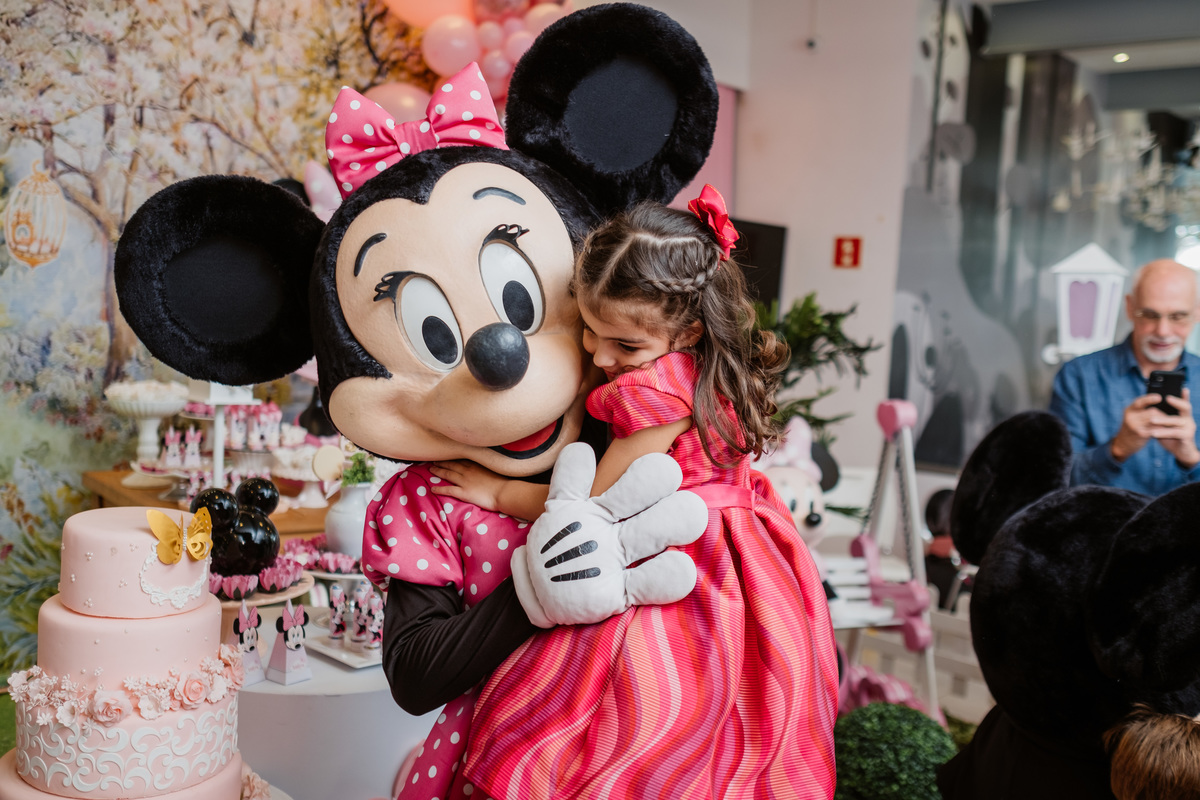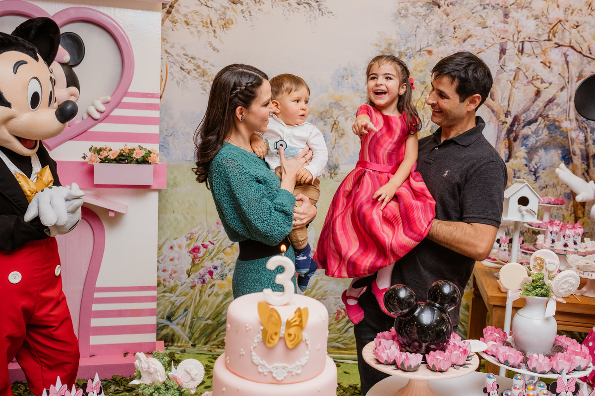 O aniversário da Luísa aconteceu no Buffet 4 Kids, em Curitiba, tema Minnie Rosa, fotografado por Evelen Torrens.