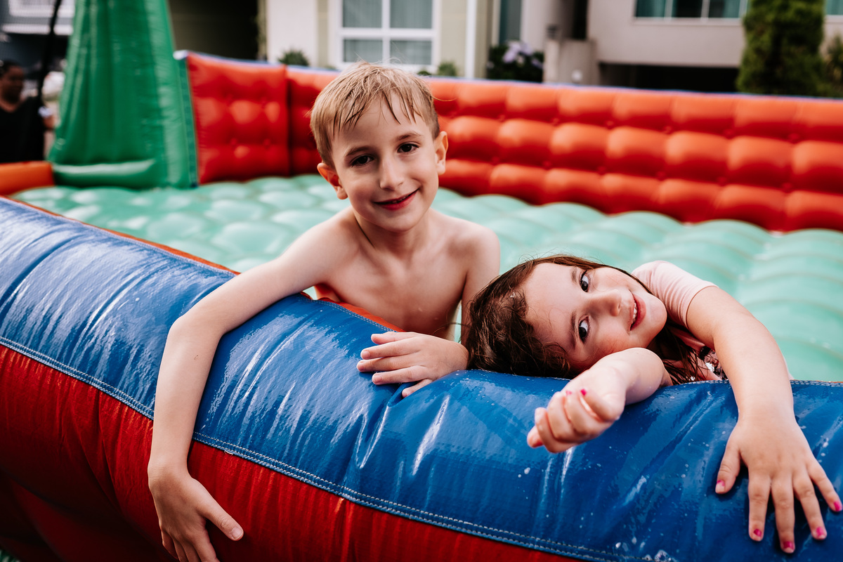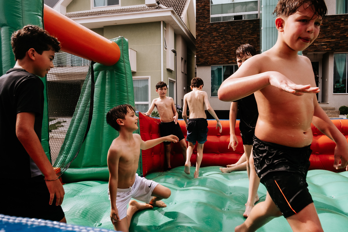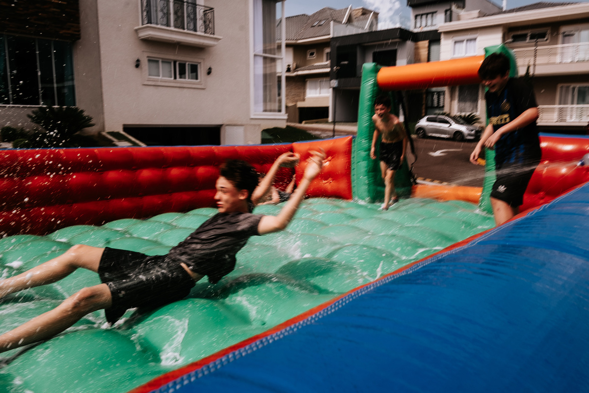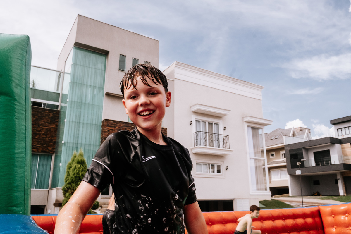 Era um domingo de primavera, mas que parecia era de tão quente. Sua mãe, a Fernanda, alugou um inflável de futebol de sabão e resolveu jogar água. Mais de 30 crianças correndo, pulando, brincando, uma farra só!