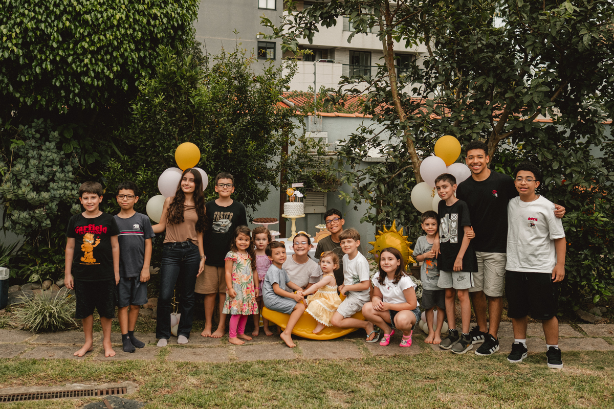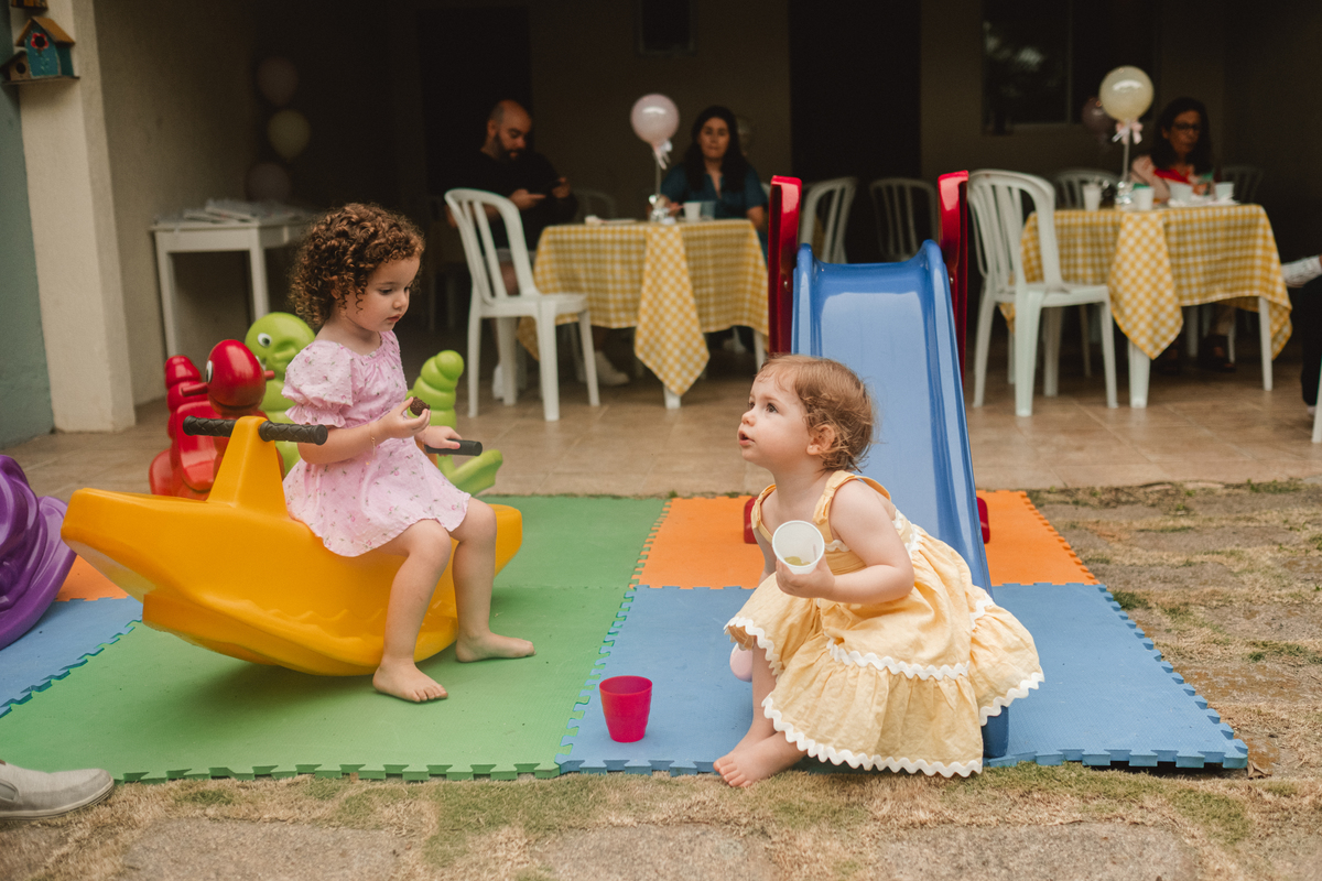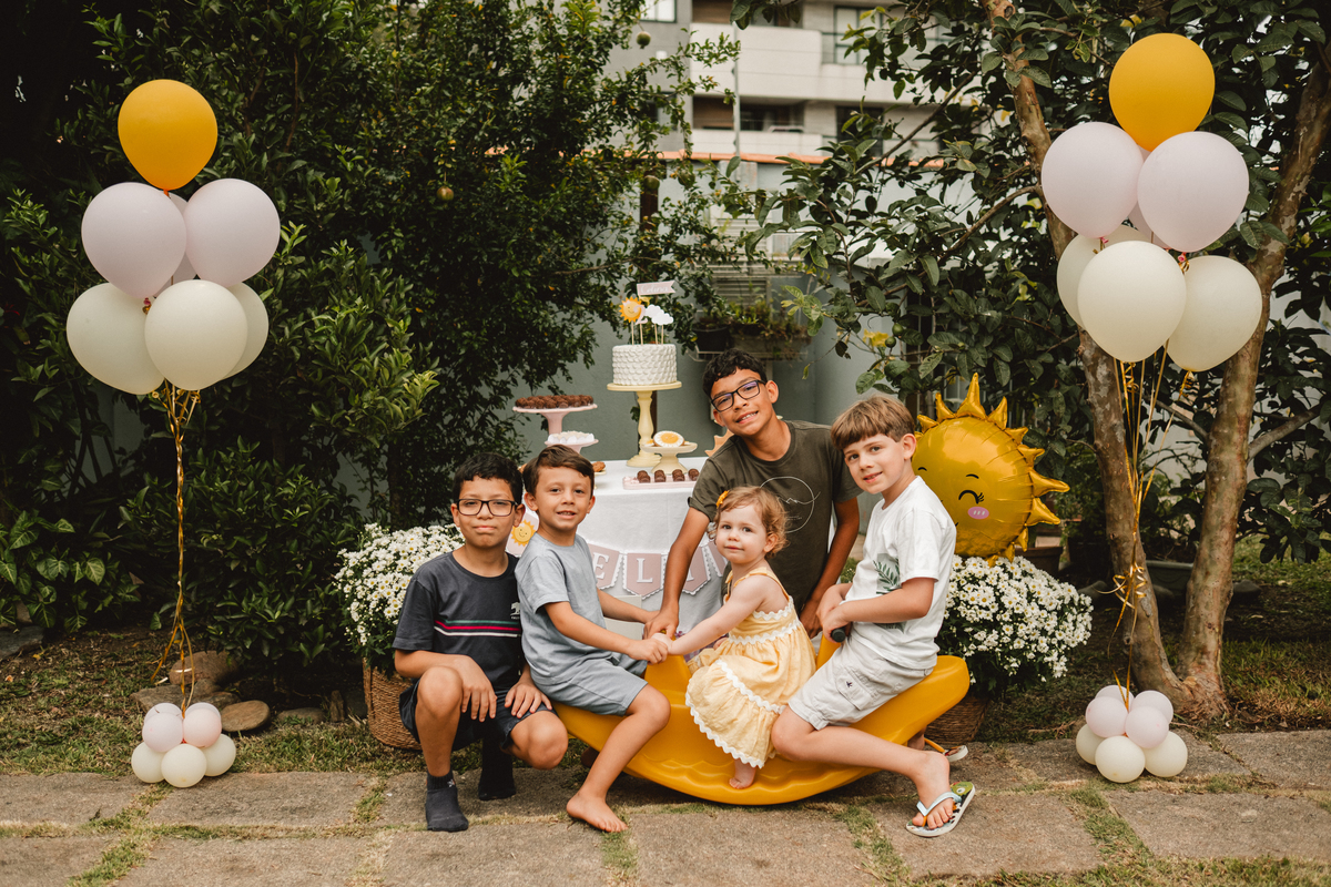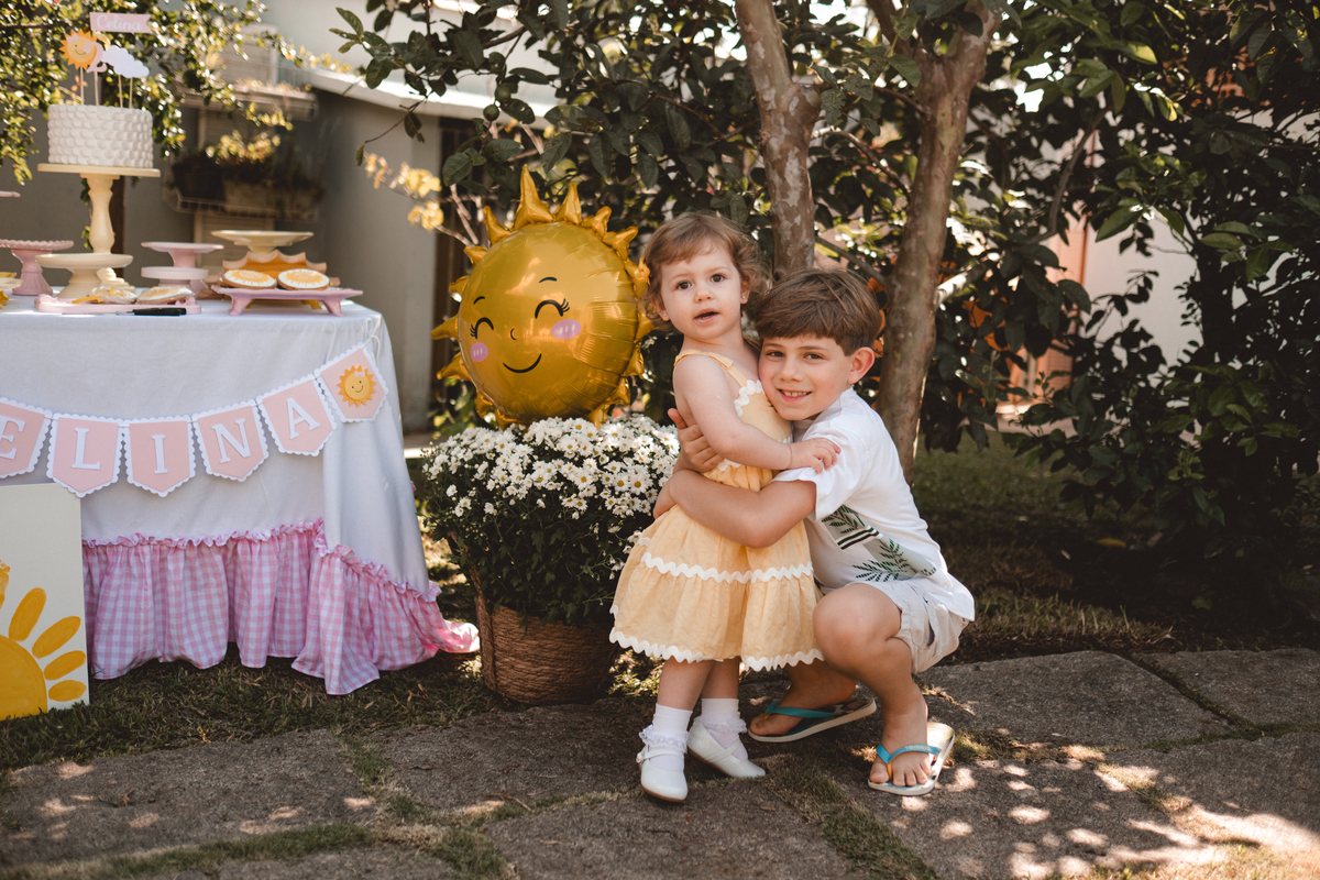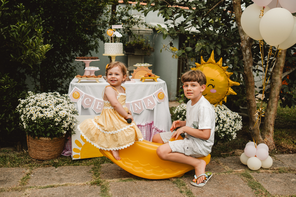 Com a decoração “Lá vem o sol”, o dia foi acompanhado por uma luz bonita que atravessou a tarde até um pôr do sol delicado. Celina viveu tudo com autonomia: brincou, explorou o espaço e dividiu momentos com o irmão, Kaique, sem interferências.