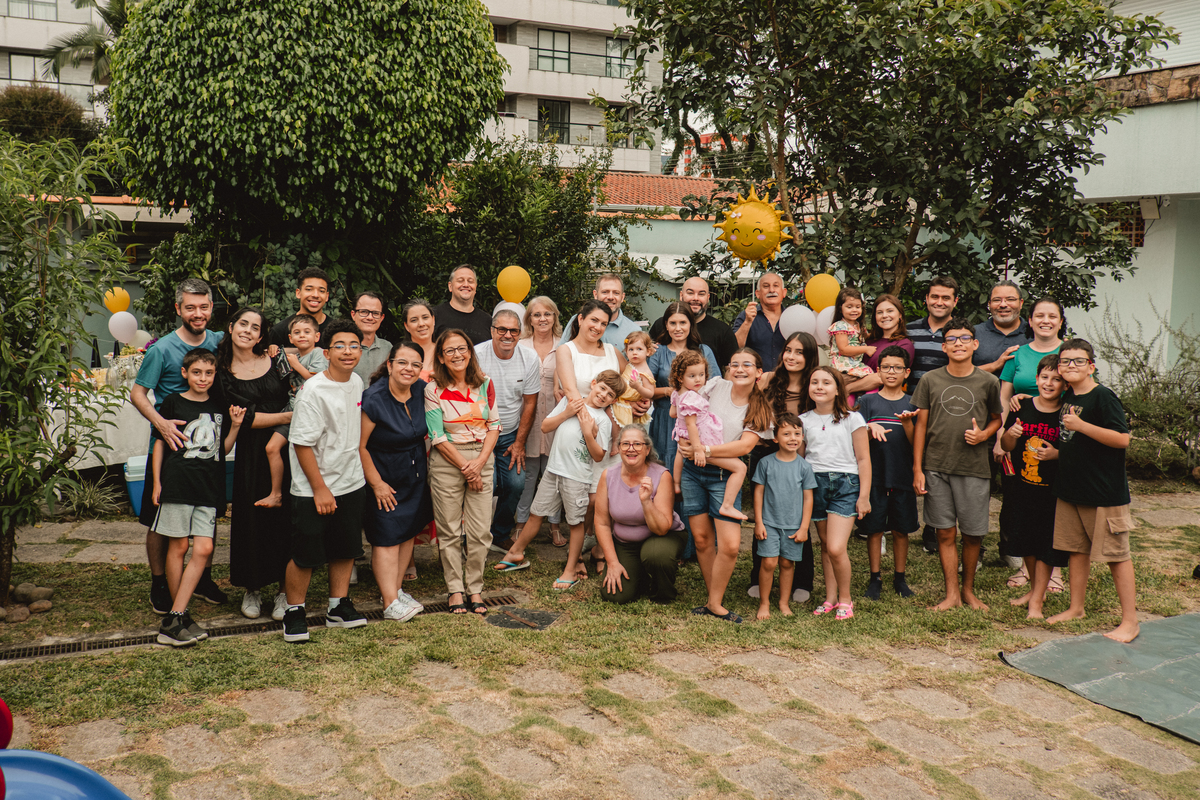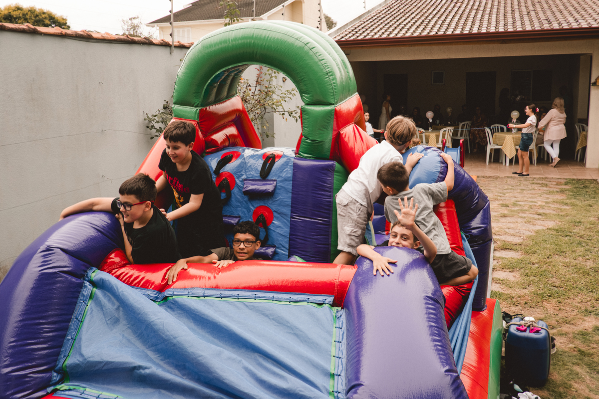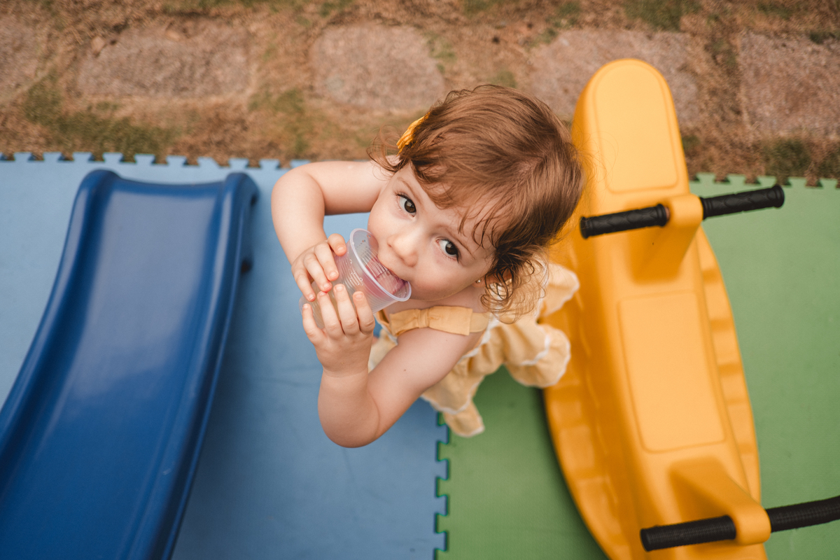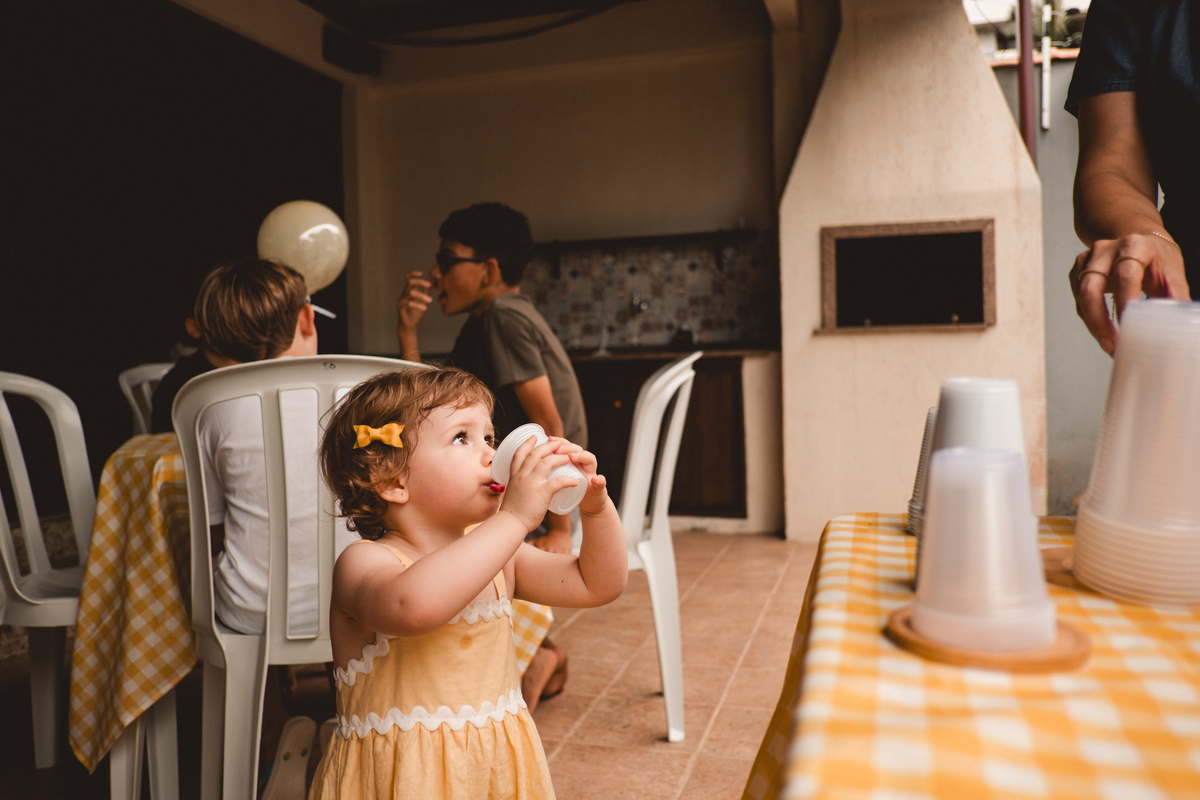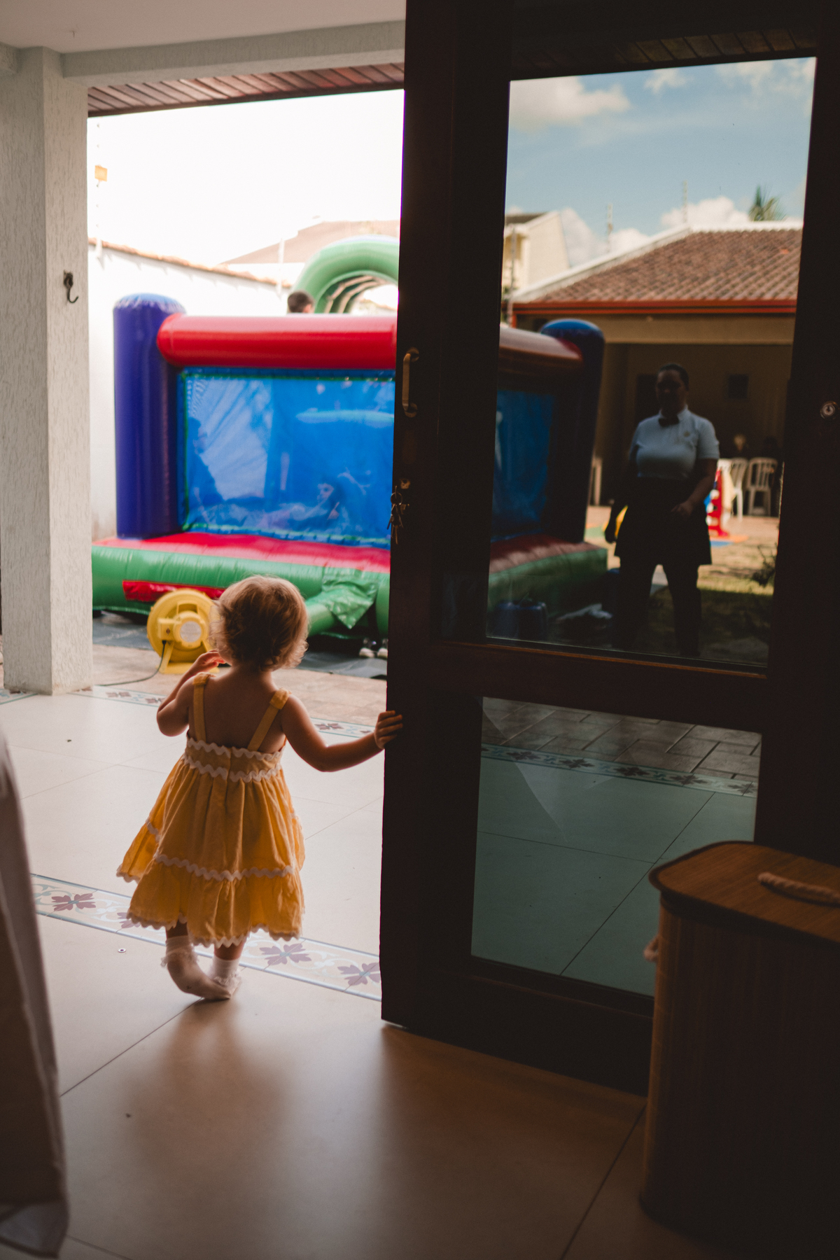 Com a decoração “Lá vem o sol”, o dia foi acompanhado por uma luz bonita que atravessou a tarde até um pôr do sol delicado. Celina viveu tudo com autonomia: brincou, explorou o espaço e dividiu momentos com o irmão, Kaique, sem interferências.