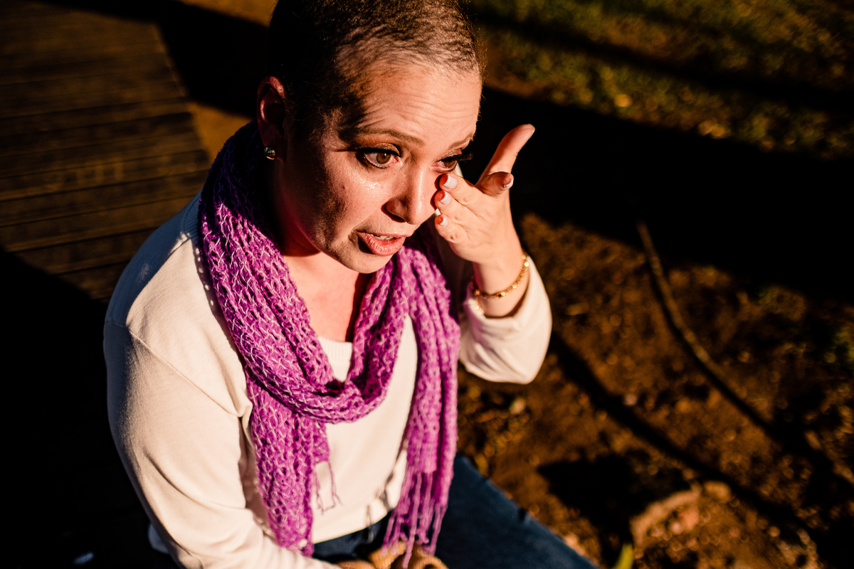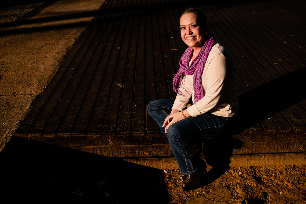Nos cumprimentamos como manda o protocolo da pandemia, de longe e sem toques, e fui conversando até encontrar a luz que considero especial. Pedi pra Lu sentar num deck de madeira sob a sombra linda de uma árvore. Comecei a conversar pra quebrar o gelo e me aprofundar mais naquela Luciana que eu estava conhecendo. Ela começou a falar sobre a sua história. Por milésimos pensei: não vou fotografar, vou filmar. Mas meu Deus Evelen, ela te contratou pra você fotografá-la, não filmá-la. Dane-se. Eu registro histórias, não importa qual meio eu use. REC sem ela saber. Minha câmera tem um modo silêncio de clicks e costumo avisar as famílias que elas não vão saber o que eu tô fotografando - santa tecnologia me ajudando naquele momento. Enfim, ela foi falando, falando, falando... Naquele instante senti que ela queria muito mais ser ouvida do que fotografada. Ela queria alguém a ouvisse, que pudesse estar ali só pra ela, pra desabafar e contar toda a sua caminhada. Fiz algumas perguntas e ela respondendo. Até que...